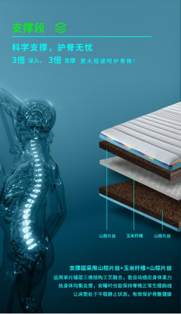 采用国际先进的植物纤维成型技术,大自然独创的“三段9层”立体结构,床垫材料选用美国航天服同款科技恒温纤维,通过物理调节,让床垫趋于恒温状态,0甲醛,自然蓄能,抑菌护脊,床垫软硬适中,缓释段采用进口乳胶+Q弹山棕+玉米纤维棉三层释压结构设计,科学利用天然材质弹性属性,逐层吸收人体重量释放肌肉压力,缓解运动后肌肉疲劳100%贴合身体曲线,让身体在睡眠中迅速得到恢复 午夜十八禁,该款产品已经为2022年北京冬奥会运动员提供,并且取得良好的成绩。